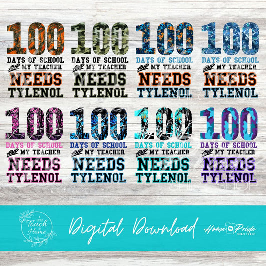 100 Days of School Camo Bundle of 8 Sublimation Designs