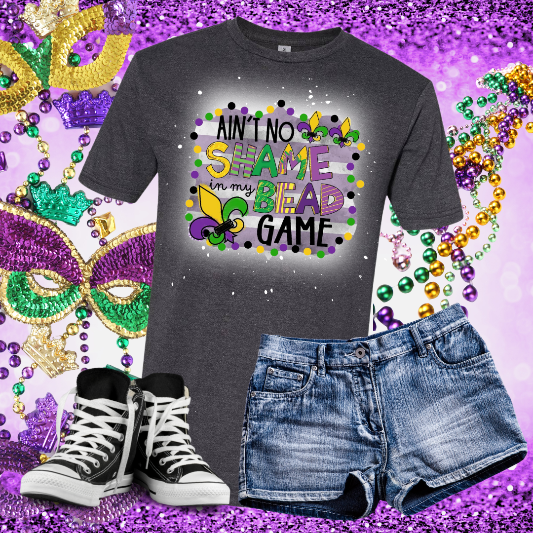 Aint No Shame in My Bead Game Mardis Gras Bleached T-Shirt