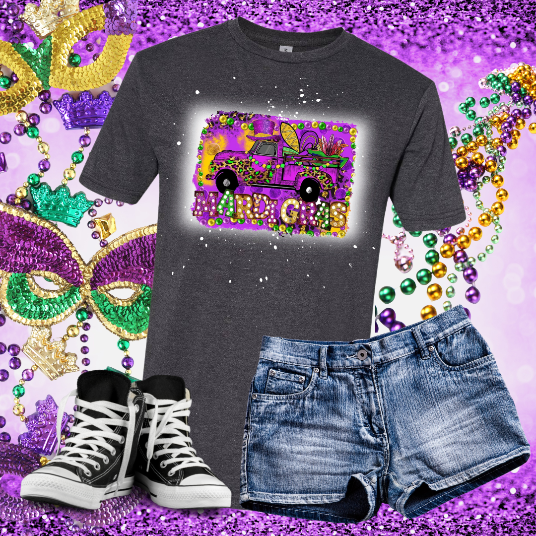 Mardis Gras Purple Top Hat Truck Bleached T-Shirt